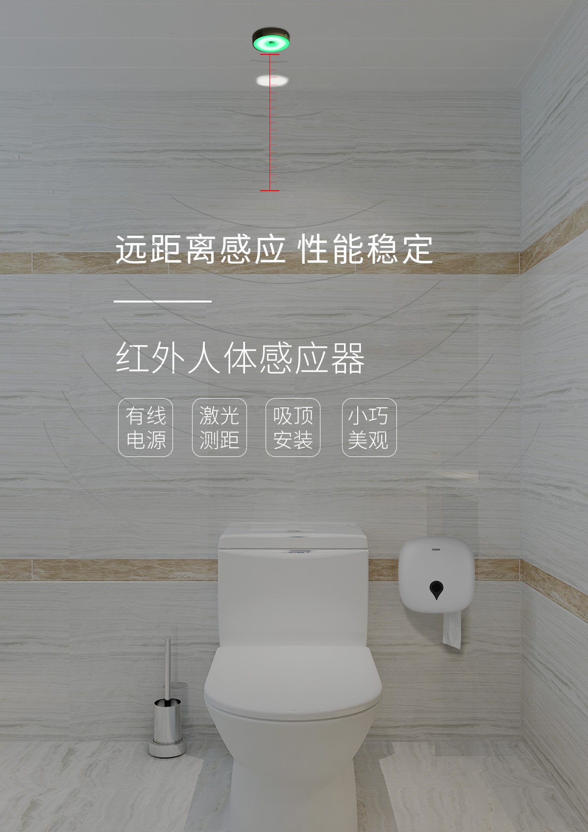 說明:蹲位紅外感應(yīng)與廁位燈一體,感應(yīng)距離3.5M,安裝在蹲位頂上。